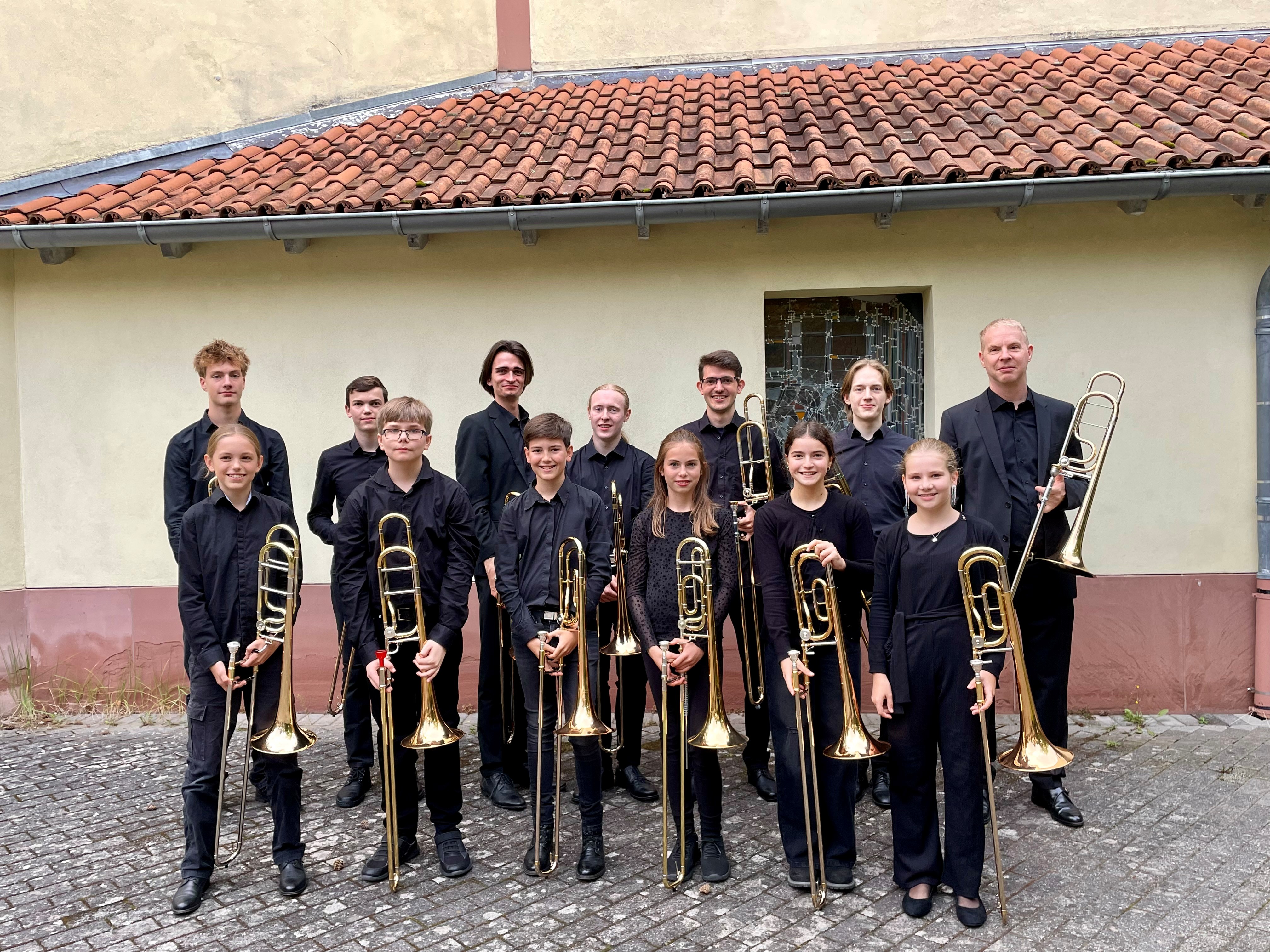 Von Donnerstag bis Sonntag (11.-14.9.) haben 12 SchülerInnen des OSGs am Posaunenkurs "Game of Trombones II" mit 23 weiteren PosaunistInnen teilgenommen. Der Kurs fand unter der Gesamtleitung des PCK-Lehrers Simon Gößling statt, der am OSG die BläserschülerInnen im Fach "Posaune" unterrichtet. Das gemeinsame intensive Proben war für alle SchülerInnen ein ganz besonderes Erlebnis, das mit einem beeindruckenden Konzert am Sonntagabend in der vollen Kirche St. Franziskus auf dem Lerchenberg gekrönt wurde. Wie sehr Musik verbindet, kann man daran erkennen, dass unter den 12 teilnehmenden SchülerInnen auch drei Schüler waren, die das OSG bereits mit ihrem Abitur verlassen haben.