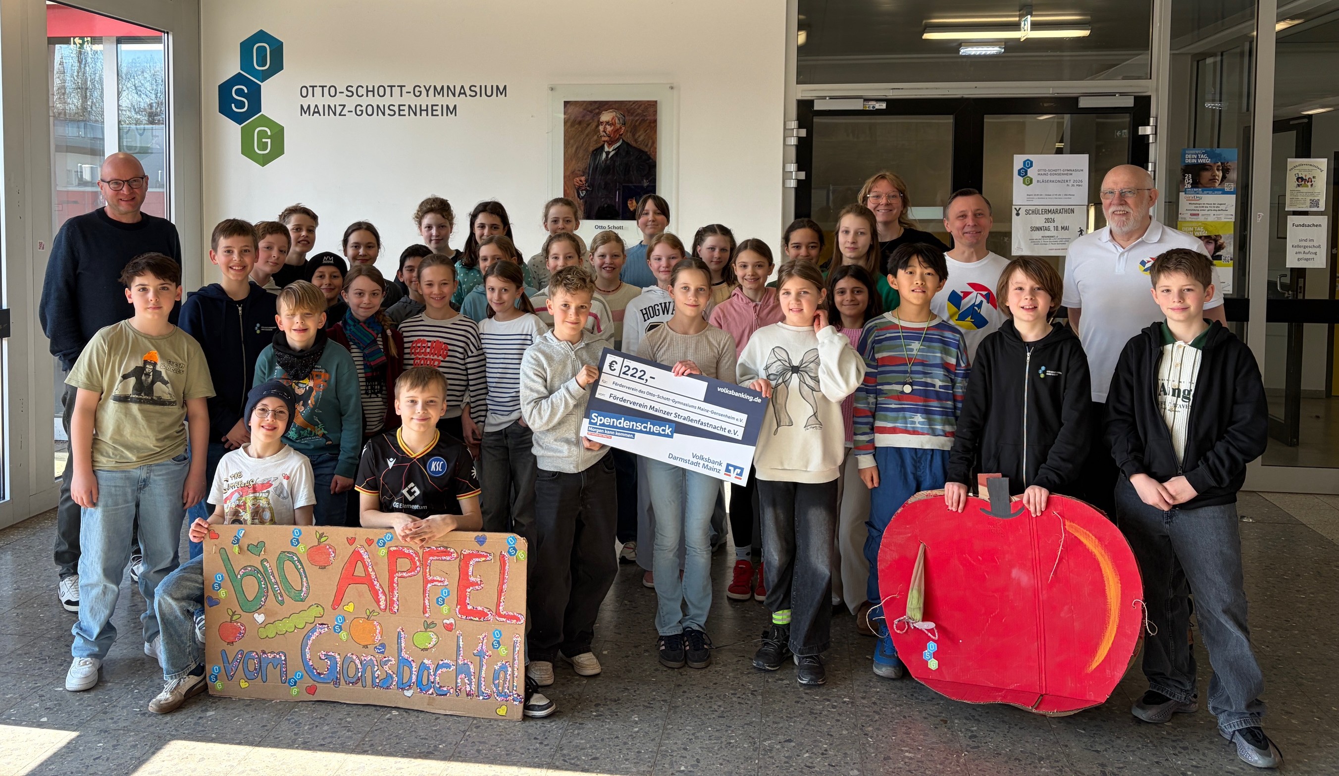 Am Mittwoch, dem 18.03.2026, wurden unsere Schülerinnen und Schüler, die verkleidet als „Bioäpfel vom Gonsbachtal“ am Jugendmaskenzug teilgenommen hatten, vom Förderverein Mainzer Straßenfastnacht e.V. für ihren besonders kreativen Beitrag ausgezeichnet und mit einem Scheck in Höhe von 222 € belohnt. Die Schulgemeinschaft gratuliert herzlich!