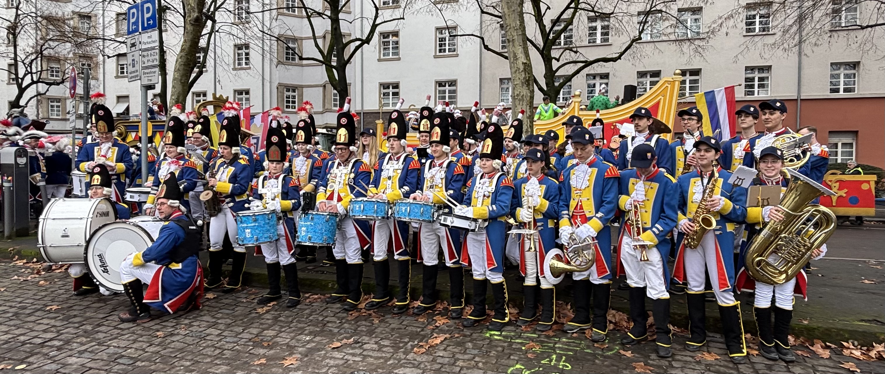 Die Brass@Gass-Band, bestehend aus OSG- und FrauenlobschülerInnen sorgt mit dem Musikzug der Füsiliere für Frohsinn auf dem Rosenmontagszug „uff dass de Kram klappt“ 🥳.